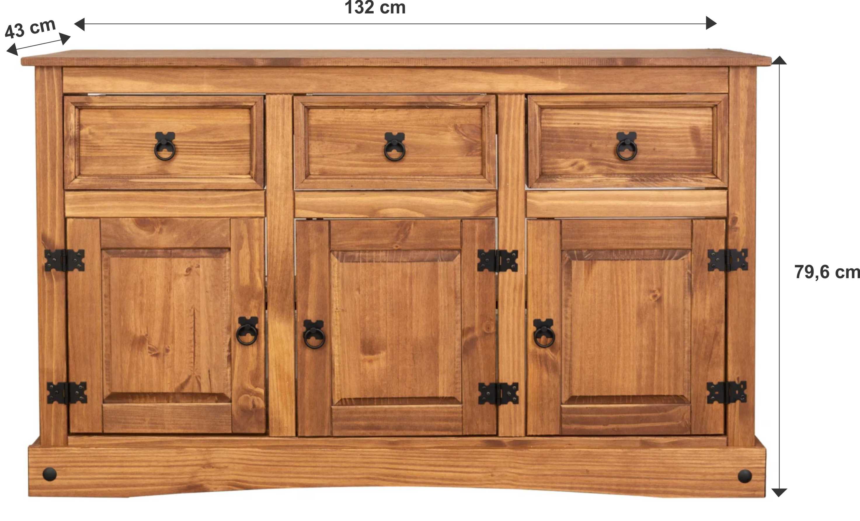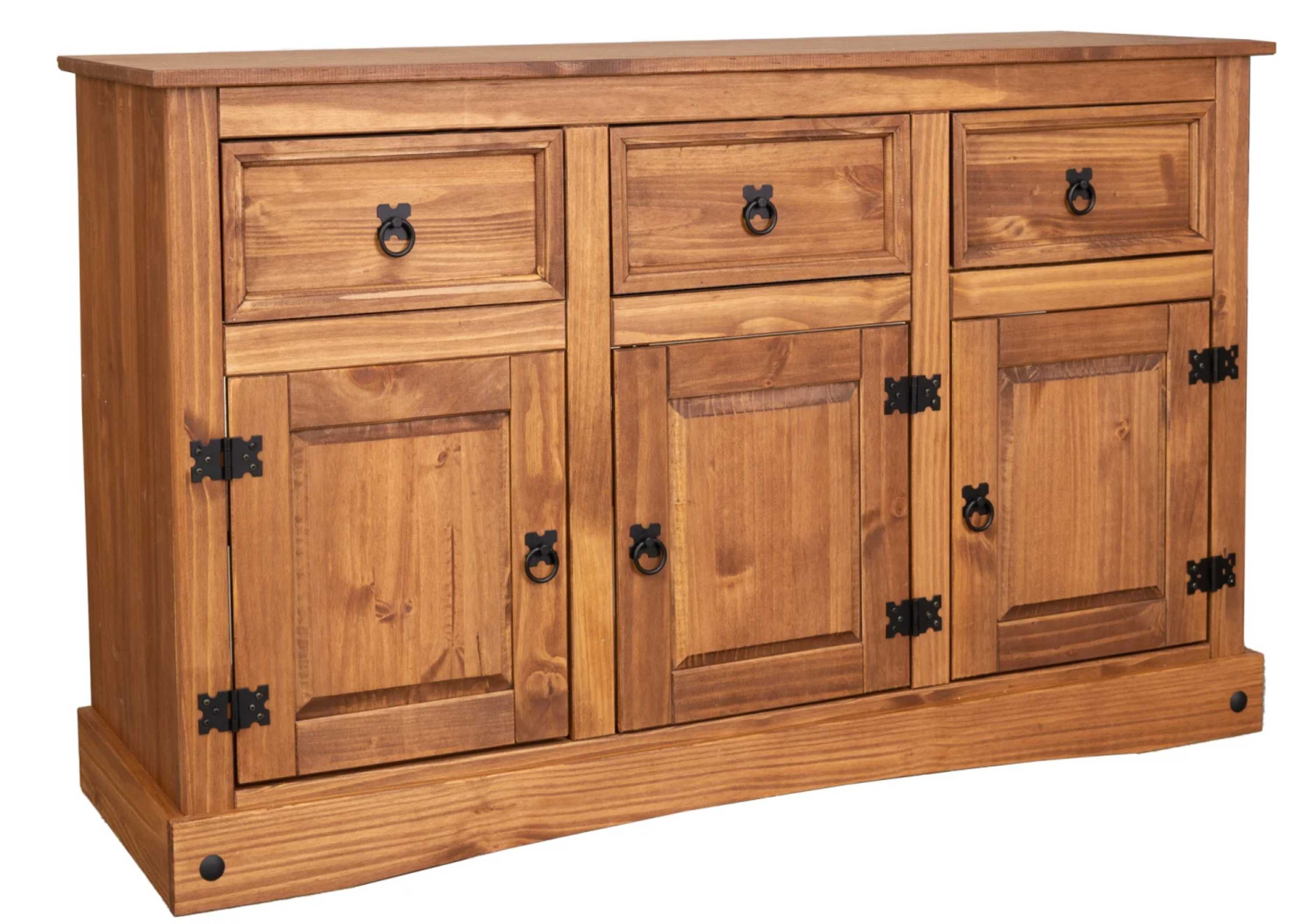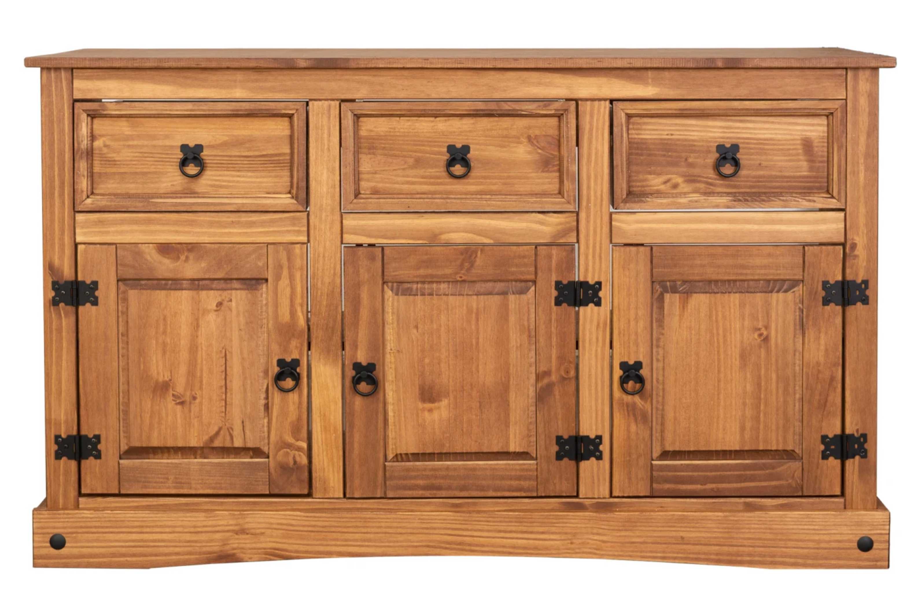 Este balcão de madeira maciça une funcionalidade e charme rústico em um só móvel. Produzido em madeira de alta qualidade, possui três portas com dobradiças metálicas e três gavetas espaçosas, ideais para organizar utensílios, louças ou objetos diversos.
