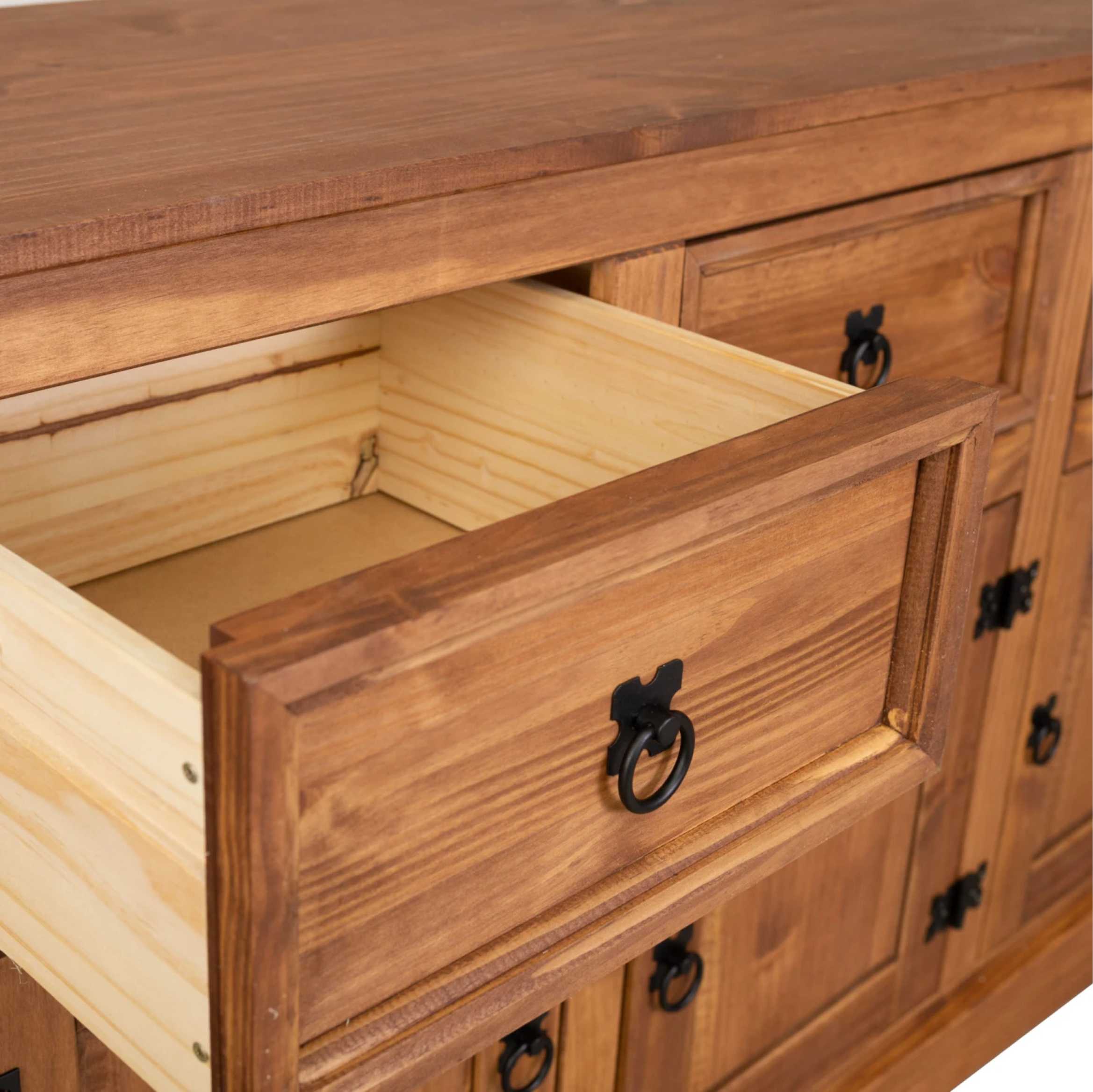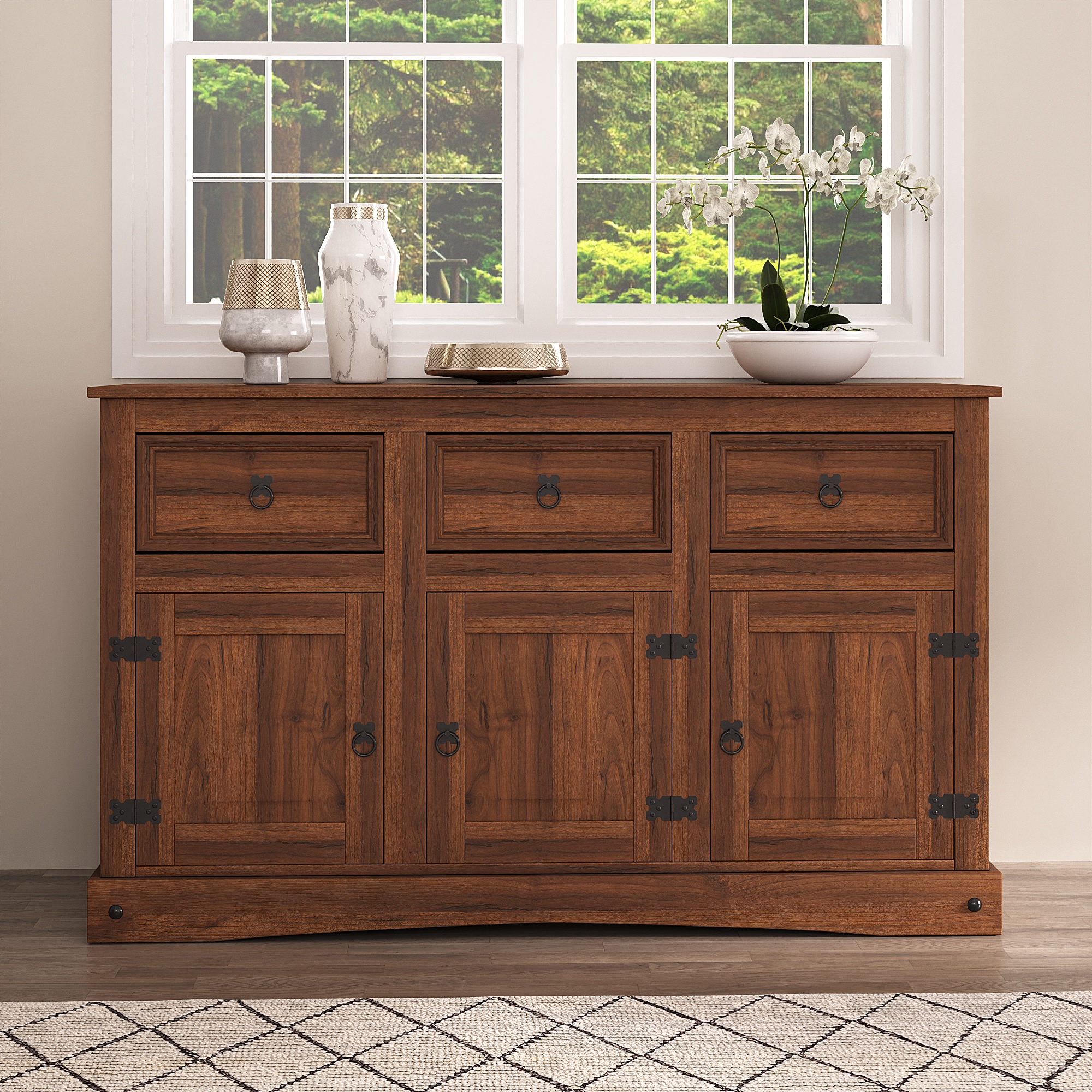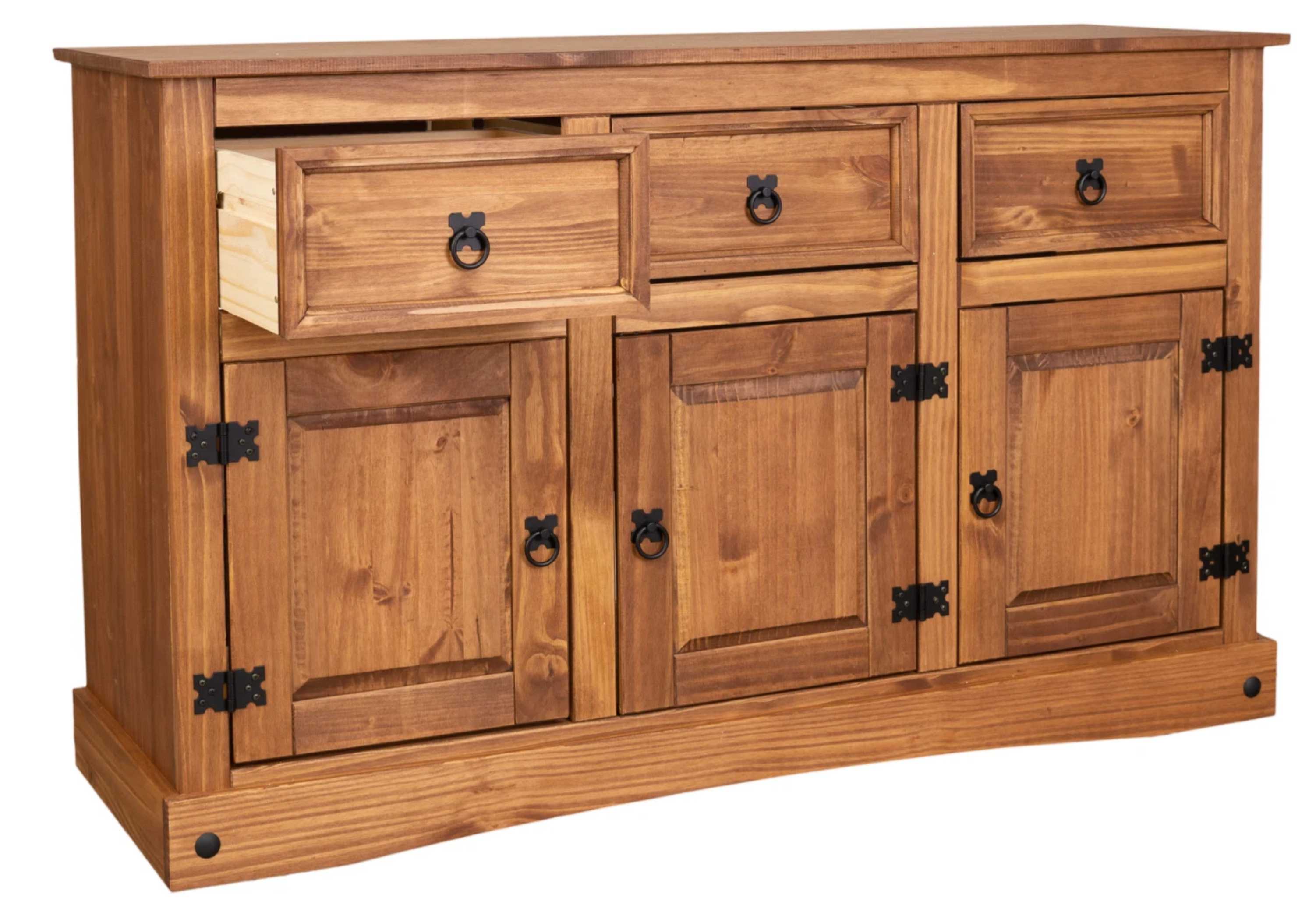 Este balcão de madeira maciça une funcionalidade e charme rústico em um só móvel. Produzido em madeira de alta qualidade, possui três portas com dobradiças metálicas e três gavetas espaçosas, ideais para organizar utensílios, louças ou objetos diversos.