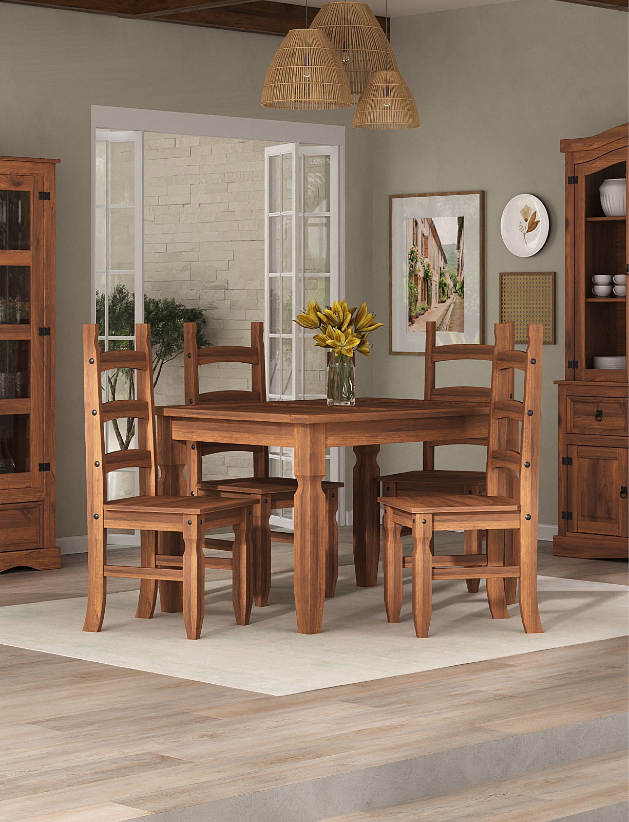 Perfeito para salas de jantar, cozinhas ou áreas gourmet, o conjunto oferece resistência para o uso diário e um visual que combina com estilos rústico, colonial e farmhouse. As cadeiras possuem encosto anatômico, garantindo conforto durante as refeições e momentos em família.